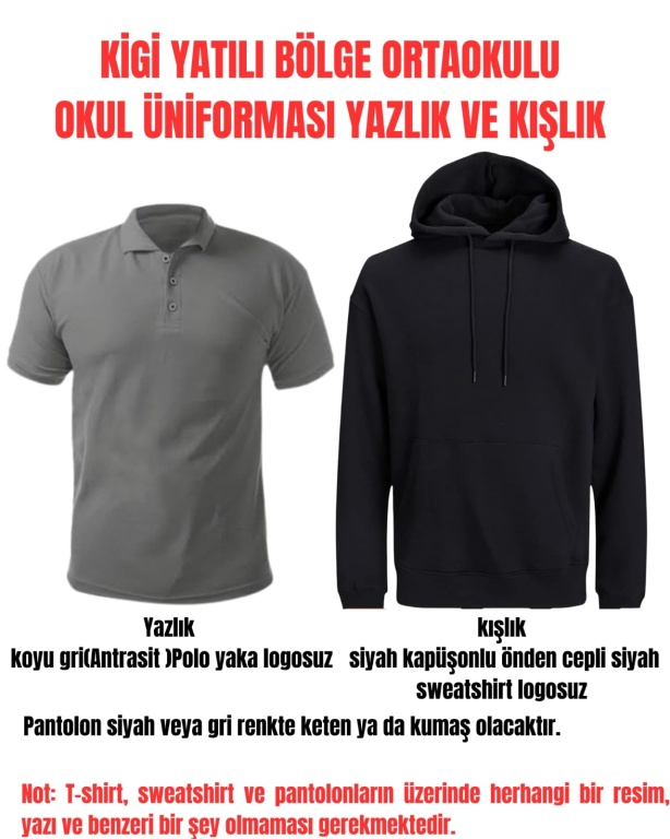 1. 2025 /2026 Eğitim-Öğretim yılı ve sonraki yıllarda okula kayıt kız ve erkek öğrencilerin aşağıda belirlenen yeni kıyafetle, diğer sınıflarda okuyan öğrencilerin ise önceki kıyafetleri ile okula devam etmelerine,